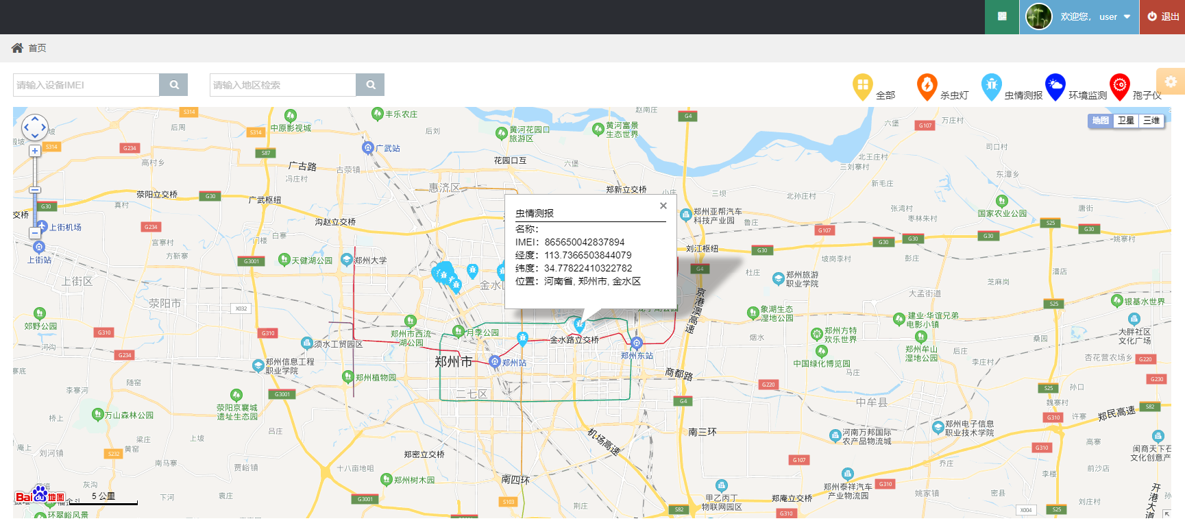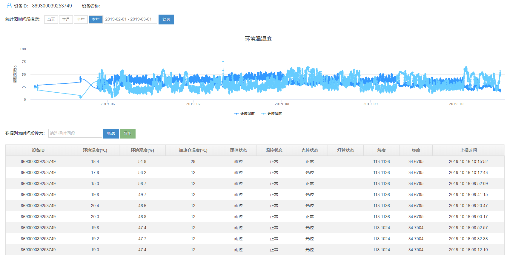 4、設(shè)備可以實(shí)時(shí)顯示空氣溫度、濕度、加熱倉(cāng)溫度、雨控、溫控、光控的狀態(tài)、經(jīng)緯度值以及數(shù)據(jù)上報(bào)的時(shí)間??諝鉁貪穸葦?shù)據(jù)實(shí)時(shí)顯示,能夠以圖表和折線圖的形式展現(xiàn),方便用戶結(jié)合害蟲(chóng)的發(fā)生情況,更加準(zhǔn)確的對(duì)蟲(chóng)害的發(fā)生進(jìn)行趨勢(shì)進(jìn)行分析和預(yù)警。