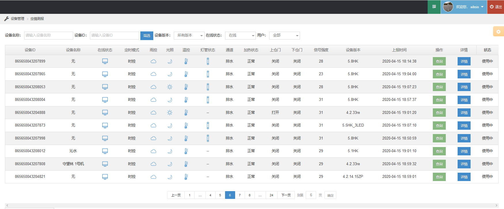 2、可以實(shí)時(shí)查看設(shè)備的定時(shí)模式、光控、雨控、溫控、落蟲(chóng)、加熱、倉(cāng)門(mén)開(kāi)啟、信號(hào)強(qiáng)度、流量使用情況等工作狀態(tài)信息,能夠準(zhǔn)確的了解設(shè)備的實(shí)時(shí)的工作情況,可對(duì)設(shè)備出現(xiàn)的故障進(jìn)行研判、分析、和預(yù)警。